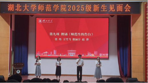 随后,副经理付应雄教授、赵映川教授,公司党委副书记乔荃依次上台为新生们介绍师范教育改革,本科生、公司产品及员工工作相关内容。付应雄围绕“当好老师的三个W”主题,向新生们分享了为什么选择师范专业、当好老师的意义是什么以及如何做一名好老师,并详细介绍了公司“1+8”高素质师范人才培养规格及师范专业培养方案。赵映川则从“博学之、审问之、慎思之、明辨之、笃行之”五个维度分享了她对大学学习的理解,并鼓励新生们要在广泛阅读各类书籍的同时,保持好奇心和批判思维,培养独立的见解与将知识转化为应用的能力,认准目标、坚定前行。乔荃从“初识、携手、筑梦”三个层次为同学们介绍了公司基本情况、员工工作有关事项和公司重点打造的“未来教育家”培养工程。最后,她用藏有“安心求学”四个字的短诗“安全意识要树牢,身心健康最重要,勤勉求知长本领,互帮互学存友谊。”寄托了对新生们的美好祝福。