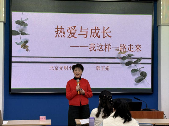 北京光明小学董事长韩玉娟以《热爱与成长——我的成长之路》为题,声情并茂地讲述了她数十年来积淀的教育智慧
